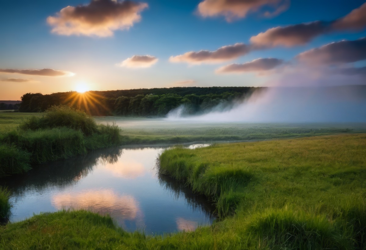那是一条蜿蜒的小河,清澈见底,宛如一条银带镶嵌在大地之上。河面倒映着蓝天白云和岸边的树木,美得如同一幅流动的画卷。 河岸两侧,郁郁葱葱的草地如同绿色的地毯,柔软而细腻。草地上,散落着几棵树木,它们或高或矮,形态各异,为这片草地增添了几分生气。远处,一片茂密的森林映入眼帘,树木的颜色从深绿到浅绿不等,仿佛是大自然调色盘上的杰作。 抬头仰望,天空占据了视线的大部分。那是一片渐变的蓝色和橙色,宛如艺术家的画布,美得令人窒息。太阳正从地平线上升起,发出金色的光芒,照亮了整个世界。此刻,我感受到了大自然的魅力,仿佛所有的烦恼都被这温暖的阳光融化了。 最让我难忘的是那天空中飘浮的薄雾,它们像轻纱一般,轻轻覆盖在山林之上,给这片美景增添了几分神秘感。我仿佛置身于仙境之中,感受到了大自然的神秘与美丽。