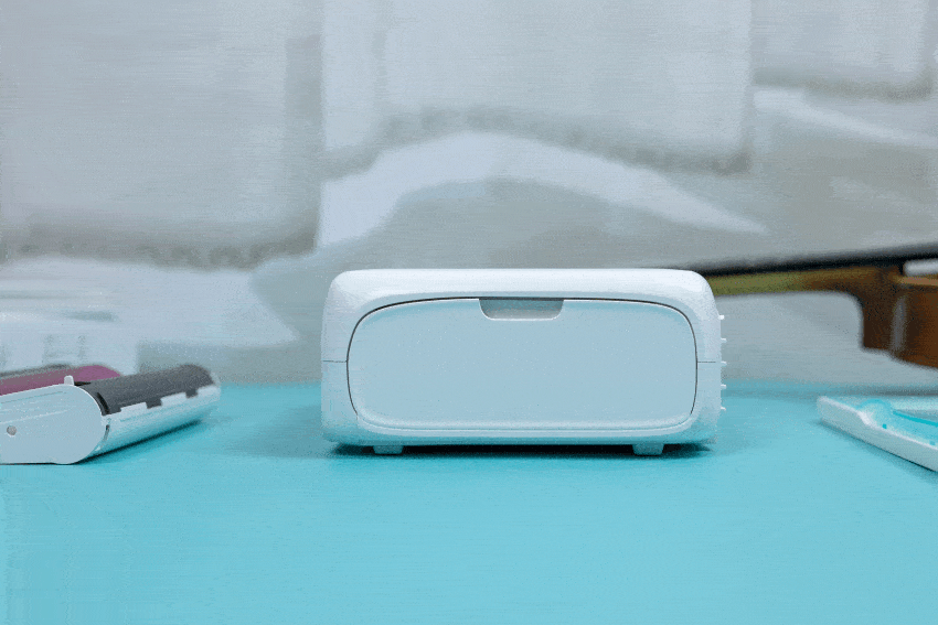 纸匣的安装和色带一样非常简单,先将取出的相纸光面向上放入纸匣。再打开打印机前方的纸匣仓门,将纸匣安装到机器上就可以了。