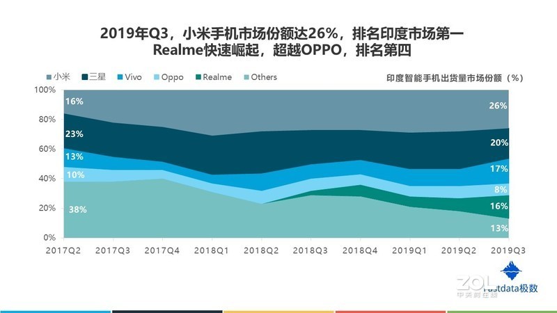 根据Fastdata极数近日发布的《2019年印度互联网发展趋势报告》,2019年Q3小米蝉联印度智能手机霸主地位,Realme超越OPPO排名第四!!!